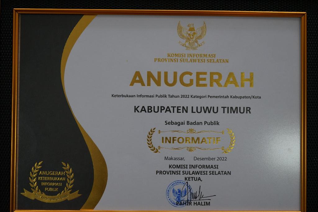 Penghargaan Anugerah Keterbukaan Informasi Publik Tahun 2022 Kategori Kabupaten/Kota Pemerintah Kabupaten Luwu Timur Sebagai Badan Publik INFORMATIF